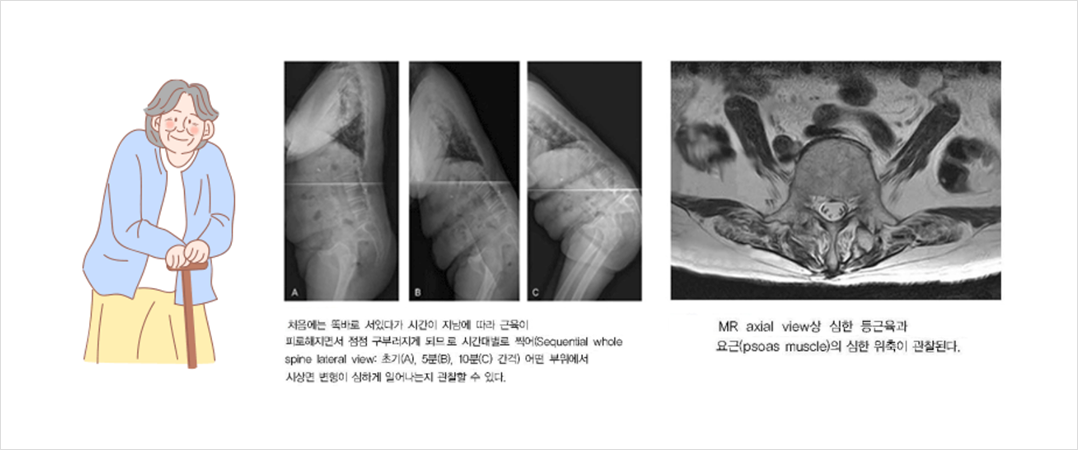 퇴행성 측만증이 동반되어 몸이 옆으로 기울어지는 모습이 같이 나타나기도 하고 조금만 걸어도 힘들고 피곤해지며 낙상의 위험도 높아집니다.