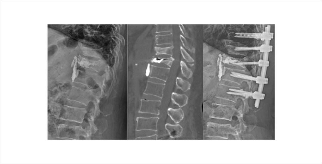 척추체 성형술을 시행하였지만 골시멘트와 유합이 일어나지 않고 척추체 내부에 괴사가 일어나면서 척추체의 붕괴가 진행되고 이로 인한 통증이 지속되는 경우도 있습니다. 이러한 경우에는 척추 불안정과 지속되는 통증을 해결하기 위해 척추체 고정술이 필요할 수 있습니다.